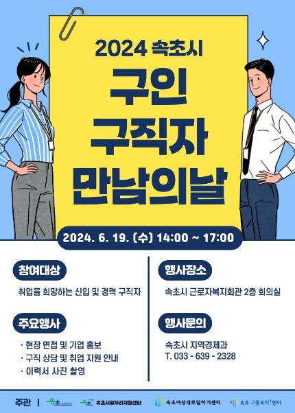 인사이드피플 강애자 기자 | 속초시는 구직자들에게 다양한 취업정보를 제공하고 구인·구직자 간 상호정보 교환과 더불어 현장면접을 통한 실질적인 일자리 제공을 위해 오는 19일'2024년 속초시 구인․구직자 만남의 날'을 속초시근로자복지회관 2층 회의실(청초호반로 201)에서 개최한다.
