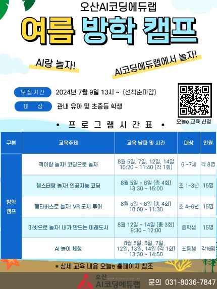 인사이드피플 강애자 기자 | 오산시는 오산AI코딩에듀랩에서 여름 방학을 맞아 인공지능 코딩, 로봇, 메타버스를 비롯한 다양한 디지털 신기술들을 배우고 체험할 수 있는‘2024 여름방학 캠프’를 운영한다고 전했다.