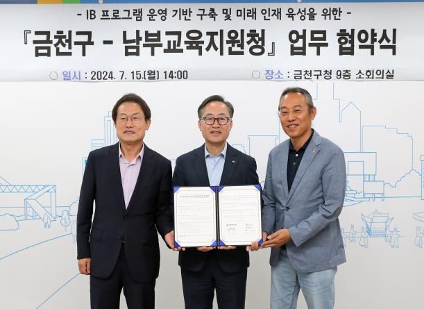 유성훈 금천구청장은 “서울시 자치구 최초로 교육지원청과 IB 프로그램 운영 기반 구축을 위한 협약을 맺게 되어 그 의미가 크다”라며, “이번 협약을 통해 금천구가 IB 교육 특구로 자리매김할 수 있는 기틀을 마련하여 더 많은 학생에게 다양한 교육 기회를 제공할 수 있도록 지원을 아끼지 않겠다”라고 말했다.