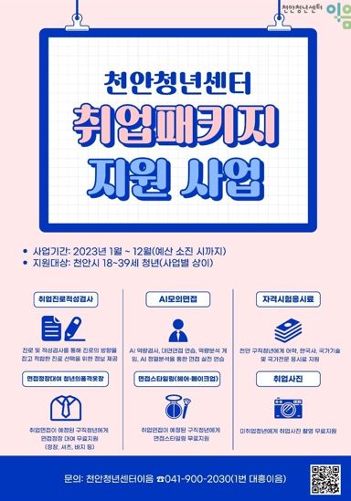 박상돈 천안시장은 “취업 준비에 꼭 필요한 요소들을 원스톱으로 지원하는 취업패키지 지원사업은 청년들의 안정적이고 원활한 구직 활동에 큰 도움이 될 것”이라며 “많은 청년이 관심을 가지고 참여해 주길 바란다”고 밝혔다.
