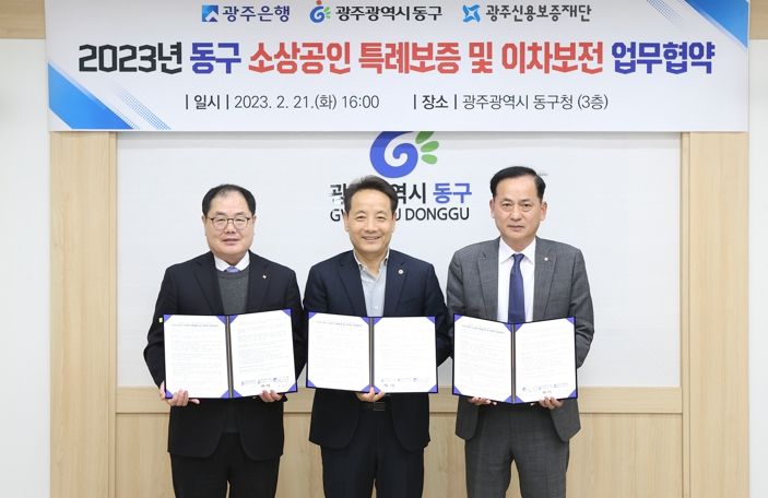 이를 위해 동구는 지난 21일 광주은행·광주신용보증재단과 ‘2023년 동구 소상공인 특례 보증 및 이자 차액 보전 협약’을 체결했다. 이번 협약으로 동구와 광주은행이 광주신용보증재단에 출연하고 재단에서는 12억 원 규모 내에서 대출 보증을 지원한다.