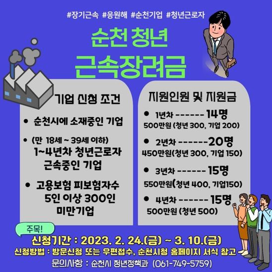 인사이드피플 이호민 기자 | 순천시가 중소기업에 취업한 청년들의 장기근속을 유도하고 정규직 일자리 취업 촉진을 위해 2023년 청년 근속장려금 지원사업에 참여할 기업을 3월 10일까지 모집한다고 밝혔다.
