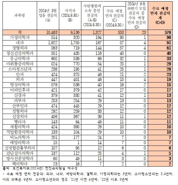 보건복지부가 파악하고 있는 100개 수련병원의 9월 30일자 기준, 실제 출근중인 전공의는 898명이었으며, 이 중 수료 예정 연차인 전공의는 396명인 것으로 나타났다. 396명을 전문과목별로 살펴보면 내과 63명, 가정의학과 47명, 정형외과 46명, 응급의학과 30명, 소아청소년과 25명 순이었다. 다만, 보건복지부는 제출자료 관련, 100개 수련병원을 대상으로 조사한 결과(의사 집단행동 중앙재난안전대책본부 체계상 보건복지부는 100개, 행정안전부는 111개 수련병원 출근율 파악중이며, 행정안전부는 전문과목별 출근율은 파악하지 않고 있음)이기 때문에, 실제로 출근중인 전공의는 이보다 많을 수 있다고 밝혔다.