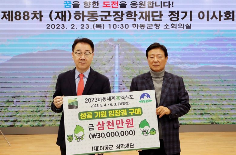 인사이드피플 이호민 기자 | 하동군장학재단은 지난 23일 군청 소회의실에서 2023하동세계차엑스포 성공 개최를 위해 하동 관내 학생들을 위한 엑스포 입장권 구매 약정을 체결했다고 2일 밝혔다.