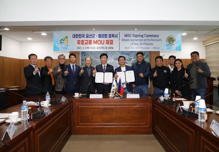 인사이드피플 이호민 기자 | 금산군은 지난 2일 박범인 금산군수, 제이미 벤존 카필 포락시장 등 20여 명이 참석한 가운데 필리핀 포락시와 국제우호교류 MOU를 체결했다.