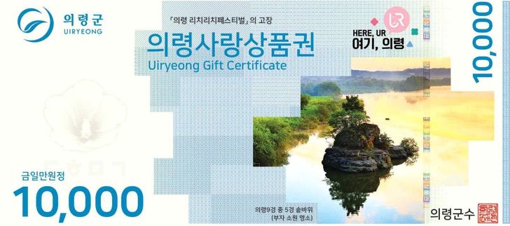 또 새로운 지류 의령사랑 상품권 디자인으로 의령 명소인 솥바위 사진과 “HERE UR, 여기 의령'이라는 대표 관광 표어를 삽입하여 특색을 배가시켰다. 지난해 성공을 거둔 '의령 리치리치 페스티벌의 고장'이라는 문구도 넣어 관광 홍보 마케팅 기능도 수행토록 했다.