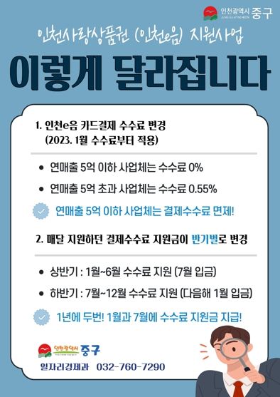 인사이드피플 이호민 기자 | 인천광역시 중구는 관내 소상공인의 경영 안정화와 지역경제 활성화를 위해 시행하던 ‘인천e음 결제수수료 지원사업’이 변경된다고 9일 밝혔다.
