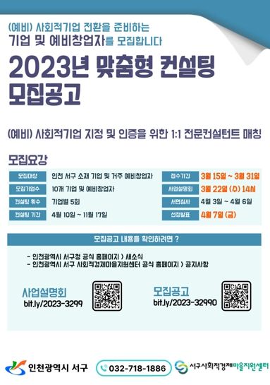인사이드피플 이호민 기자 | 인천 서구가 인증 사회적기업과 예비 사회적기업을 준비하는 기업, 예비창업자를 대상으로 맞춤형 컨설팅을 진행하고 오는 31일까지 참여 기업을 모집한다고 15일 밝혔다.
