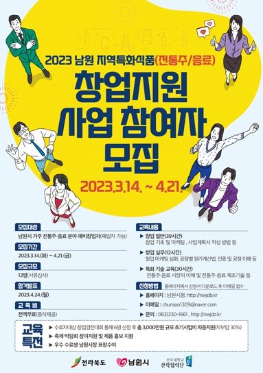 이 사업은 남원시가 ‘청년 창업’을 통한 양질의 일자리 창출을 위해 전주대 산학협력단과 컨소시엄을 구성, 전라북도 주관인 ‘지역산업 맞춤형 일자리 창출 지원사업’공모에 선정되어 추진하는 사업으로 시는 MZ세대와 최근 소비트랜드에 적합한 ‘전통주·음료’ 관련 신규 창업자를 창업 육성하고자 전통주·음료 제조기술, 마케팅 전략, 기술보호와 특허출원 등 전통주에 특화된 창업 교육을 진행할 예정이다.