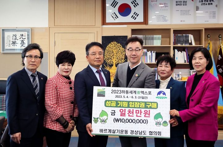 바르게살기운동 경남도협의회는 이번 약정에 입장권 1000만원 어치 1666매 구입을 약정했다. 손창봉 회장은 “차(茶)를 주제로 하는 최초의 국제행사를 도내에서 개최한다고 하니 엑스포의 성공과 하동의 차(茶)산업의 도약을 기원하는 마음에서 입장권 구매를 하게 됐다”고 말했다.