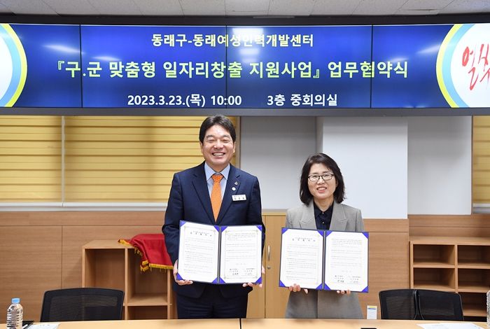 인사이드피플 이호민 기자 | 부산 동래구는 3월 23일 동래구청 회의실에서 동래여성인력개발센터와 ‘구․군 맞춤형 일자리 창출 지원사업’ 추진을 위한 업무협약을 체결했다고 밝혔다.