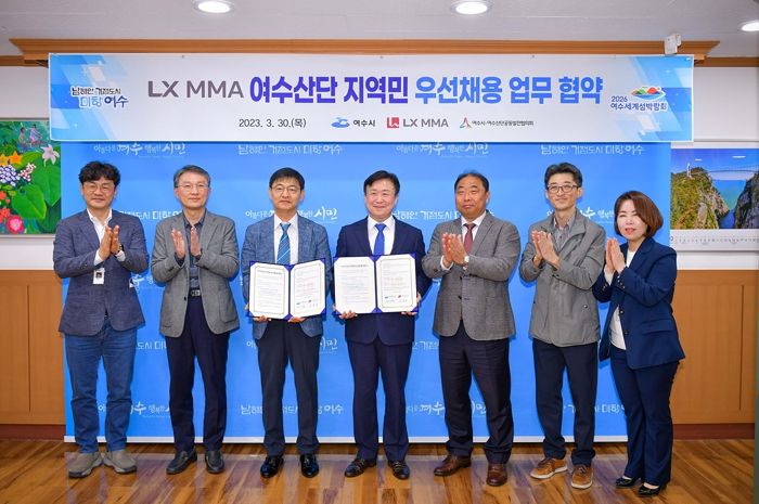 여수시는 지난 30일 오후 시장실에서 LX MMA와 ‘여수산단 지역민 우선채용’ 협약을 체결하고 청년일자리 제공과 지역발전을 위해 힘을 모으기로 했다고 3일 밝혔다.