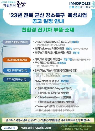 군산 강소특구 육성사업비는 2023년도 총 38억5천만원으로, 군산 강소특구의 친환경 전기차 부품소재 산업 특화분야 육성을 위해 창업에서 기술이전, 기술사업화 등 미래시장을 선도할 기술력 있는 기업육성을 위한 전주기 맞춤형 지원을 추진한다