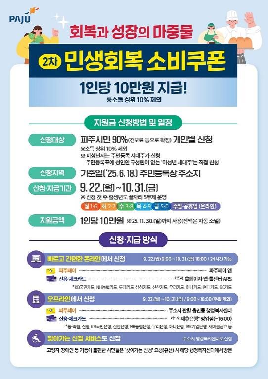 인사이드피플 이현진 기자 | 파주시는 소비 활성화 및 자영업자 매출 확대를 통한 민생경제 회복을 위해 정부가 추진하는 ‘민생회복 소비쿠폰’ 2차 지급을 오는 22일부터 10월 31일까지 실시한다고 밝혔다.