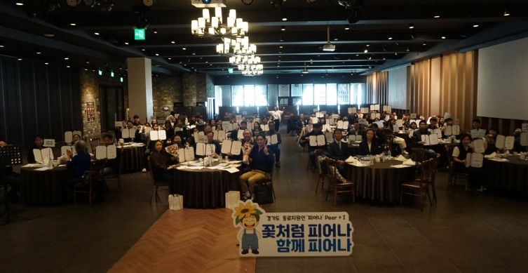 경기도는 24일 수원 호텔리츠컨벤션에서 동료지원인’ 72명의 교육 수료를 축하하는 ‘경기도 동료지원인 피어나(Peer+I) 워크숍’을 열고 활동을 격려했다.
