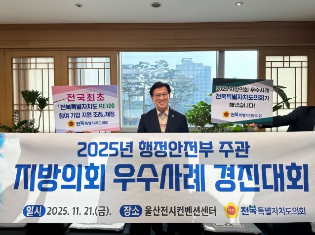 인사이드피플 김재윤 기자 | 전북특별자치도의회가 지난 21일 울산전시컨벤션센터에서 열린 행정안전부 주관 ‘2025년 지방의회 우수사례 경진대회’에서 본선에 진출해 수상하는 영예를 안았다.