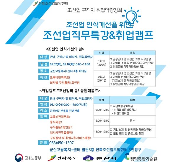 이번 직무특강은 조선업 인식개선을 목적으로 ▲ 오는 2일 및 16일 각 10시부터 12시까지 군산고용복지플러스센터 4층 대강당에서 2회에 걸처 운영된다.