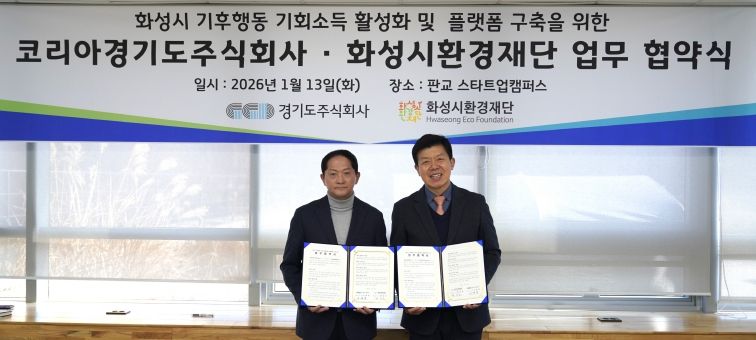 인사이드피플 이현진 기자 | 경기도주식회사는 13일 경기도 성남시 판교 스타트업캠퍼스에서 화성시환경재단과 ‘기후행동 기회소득 활성화 및 화성시 플랫폼 구축을 위한 업무협약’을 체결했다.