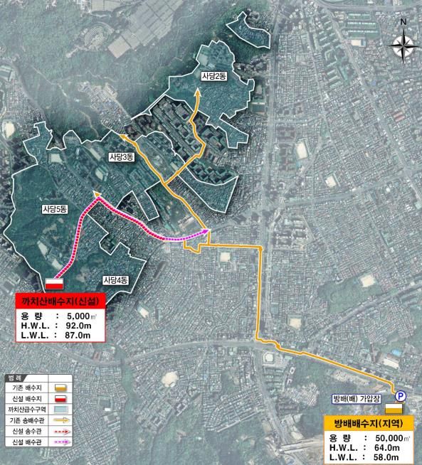 구는 사당동 일대가 재개발‧재건축 등 도시정비사업으로 인해 향후 급격한 인구 증가가 예상되는 만큼, 사전에 미리 까치산배수지 건설 사업을 추진하고 있는 것이다.