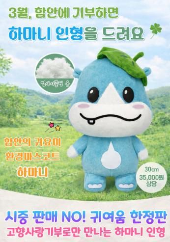 3월 1일부터 31일까지 함안군 고향사랑기부제에 10만 원 이상 기부하고 답례품 신청까지 완료한 기부자를 대상으로 자동 응모되며, 이 가운데 50명을 무작위로 추첨해 함안군 환경마스코트 ‘하마니’ 인형(3만 5000원 상당)을 증정한다.