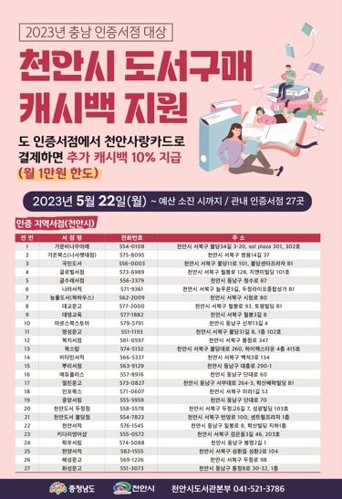 충청남도 인증서점에서 천안사랑카드로 도서 구매 시, 기존 적용되는 캐시백 10%에 추가 캐시백 10%가 적용돼 월 최대 1만 원까지 제공된다.