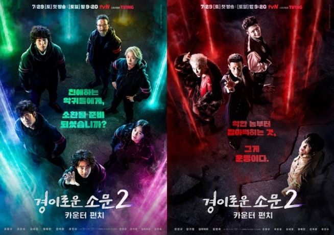 tvN 새 토일드라마 ‘경이로운 소문2: 카운터 펀치’(연출 유선동/극본 김새봄/제작 스튜디오드래곤, 베티앤크리에이터스)(이하. ‘경이로운 소문2’)가 7월 29일(토) 밤 9시 20분으로 첫 방송을 확정했다. 이와 함께 19일(월), 티저 포스터 2종을 공개해 이목을 집중시킨다.