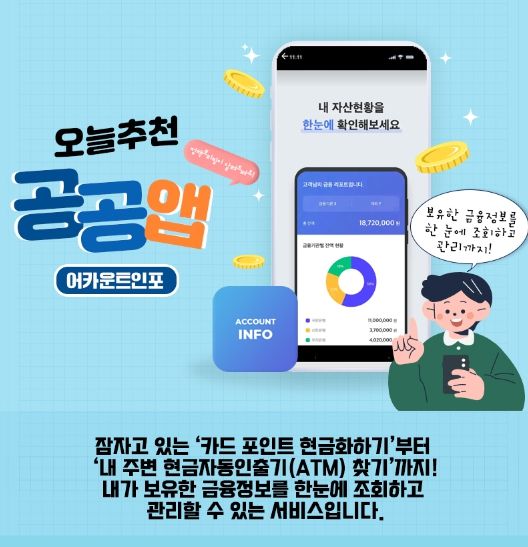 - 금융사의 현금자동인출금기(ATM)과 지점 위치, 운영시간 등 각종 정보를 한 눈에 확인할 수 있어요!