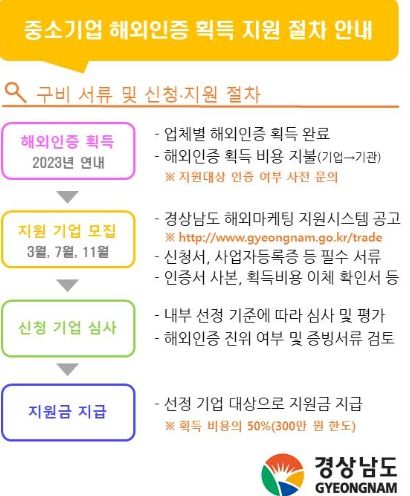 인사이드피플 박미영 기자 | 경상남도가 중소기업의 원활한 수출을 위해 ‘중소기업 해외인증 획득 지원사업’을 시행한다고 밝혔다.