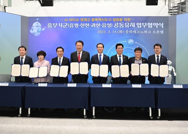 음성군을 비롯한 중부4군(진천군, 증평군, 괴산군) 단체장 및 군의회의장은 14일(15:30) 충북테크노파크에서 AI 바이오 영재고 충북혁신도시 유치를 위한 협약식을 가졌다.