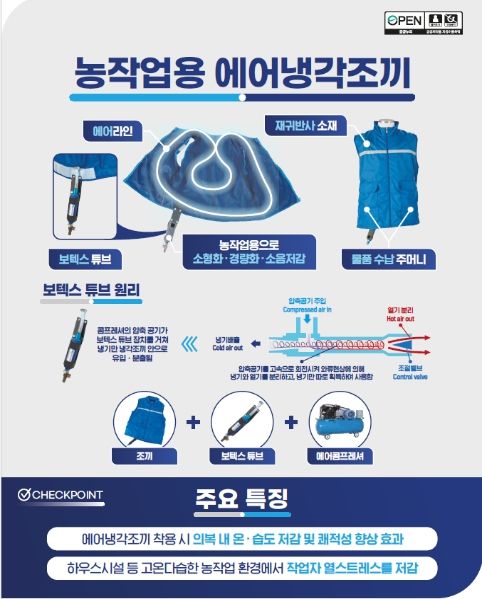 농촌진흥청이 2019년 개발한 에어냉각조끼는 보텍스 튜브와 에어라인이 조끼에 부착돼 있다. 에어콤프레셔의 압축공기가 보텍스 튜브를 거쳐 냉기만 조끼 안으로 들여보내 농작업자가 입고 있는 옷의 온도와 습도를 떨어뜨린다. 이런 원리로 고온다습한 농작업 환경에서 농작업자의 열 스트레스를 줄여준다.
