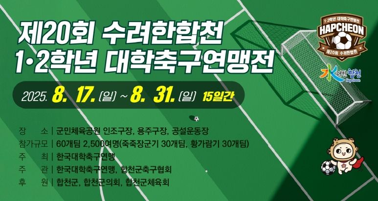 인사이드피플 조은설 기자 | 합천군은 17일부터 31일까지 15일간 ‘수려한합천 제20회 1‧2학년 대학축구연맹전’을 군민체육공원 인조구장, 용주구장, 공설운동장에서 개최한다고 밝혔다.