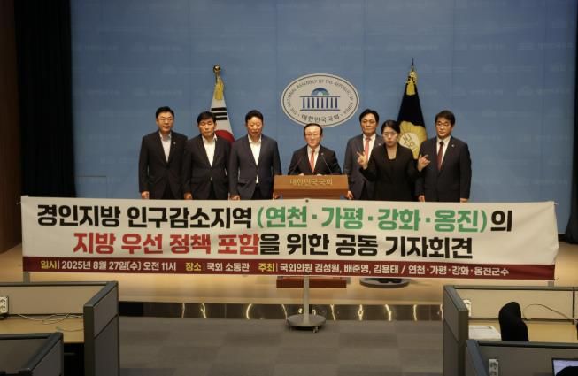 인사이드피플 노재현 기자 | 경기 연천군, 가평군, 인천 강화군, 옹진군 4개 기초자치단체는 27일 국회 소통관에서 기자회견을 열고, 정부가 균형성장을 위해 추진하는 지방 우선 정책 분야에 경인지방 인구감소지역을 포함해 달라고 촉구했다.