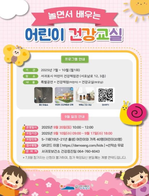인사이드피플 장은미 기자 | 서귀포시는 9월 '어린이 건강교실' 참가 가족을 모집하고 9월 20일 토요일 어린이 건강체험관, 서귀포시 건강생활지원센터에서 운영한다.