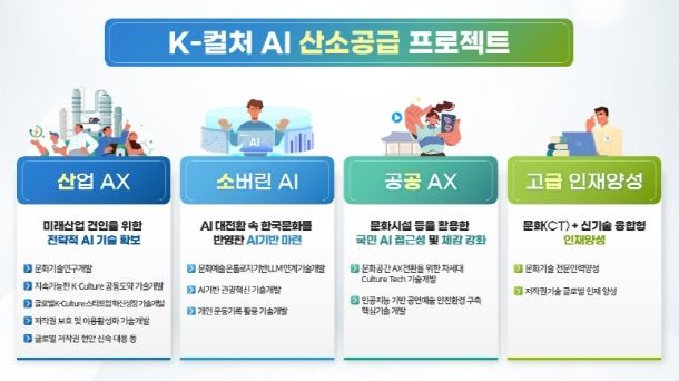 이에 2026년 문체부 연구개발(R&D) 예산은 ‘케이(K)-컬처 에이아이(AI) 산소공급 프로젝트’를 중심으로 구성해 ‘케이-컬처’의 전후방 산업 파급력을 증대시키고 ‘인공지능 3강 도약’을 위한 인공지능 활용을 극대화한다. 이를 통해 ▴콘텐츠산업의 기획부터 제작, 수출 전 과정에 인공지능 기술을 도입해 산업의 인공지능 전환(AX)을 도모하고, ▴한국문화를 반영한 인공지능 기술을 개발해 자국 인공지능(소버린 AI)을 강화한다. ▴공공 문화시설에 인공지능 기술을 적용해 국민의 인공지능 접근성과 체감도를 높이고, ▴융합형 인공지능 인재를 양성하는 사업도 추진해 ‘세계 소프트파워 5대 문화강국’ 실현에 기여할 것으로 보인다.