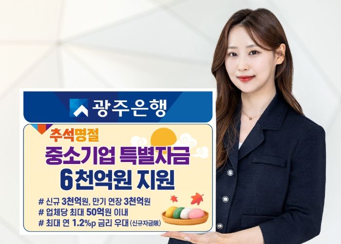 인사이드피플 심정보 기자 | 광주은행은 추석 명절을 앞두고 자금 수요에 어려움을 겪는 지역 중소기업과 소상공인을 위해 총 6천억 원 규모의 ‘추석 명절 중소기업 특별자금’을 지원한다고 지난 15일 밝혔다.