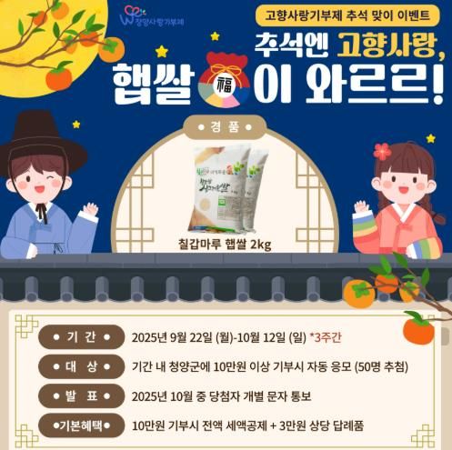 인사이드피플 심정보 기자 | 청양군은 민족 대명절 추석을 맞아 고향사랑기부제에 참여하는 기부자들에게 특별한 혜택을 제공하기 위해 오는 22일부터 다음 달 12일까지 ‘추석엔 청양사랑, 햅쌀 福이 와르르!’ 이벤트를 진행한다고 밝혔다.