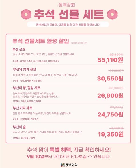 인사이드피플 심정보 기자 | 부산시는 부산 우수 제품 쇼핑 숍 '동백상회'에서 추석 명절을 앞두고 지역기업 제품으로 구성된 '선물 세트'를 출시해 오는 9월 30일까지 특별 할인 행사를 한다고 밝혔다.