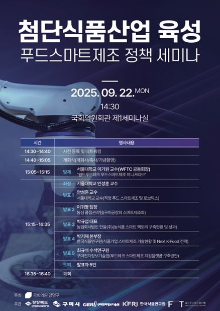 이번 세미나는 급변하는 식품산업 환경 속에서 인공지능(AI), 빅데이터, 사물인터넷(IoT) 등 첨단 기술과 융합된 푸드 스마트 제조 산업이 나아가야 할 방향을 모색하고, 산업 현장과 정책 수립 단계를 연결하는 소통의 장을 마련했다.