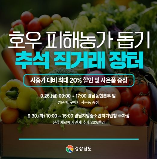 이정곤 경남도 농정국장은 “추석 명절을 맞아 수해 피해로 어려움을 겪고 있는 농업인에게 작게나마 도움이 되길 바란다”라며, “이번 행사를 위해 적극 협조해 준 공공기관 관계자 여러분께 깊이 감사드린다”라고 밝혔다.