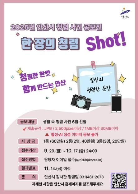 인사이드피플 노재현 기자 | 안산시는 청렴문화 확산과 시민 공감대 형성을 위해 ‘2025 한 장의 청렴, Shot! 사진 공모전’을 개최한다고 30일 밝혔다.