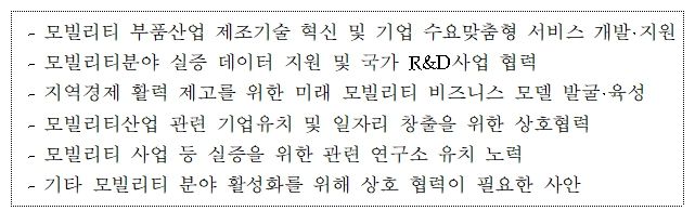앞으로 각 기관이 긴밀히 협력하여 모빌리티 분야 정보공유, 네트워크 형성 등 신규사업을 발굴·육성하고, 기업 수요맞춤형 지원 등의 협력 사업을 지속 발굴·확대해 나감으로써, 도내 중소기업 역량 강화 및 지역경제 활성화는 물론, 관련 기업 유치와 일자리 창출 등 미래 모빌리티 실증특례 도시로 발전시켜 나갈 수 있을 것으로 기대된다.