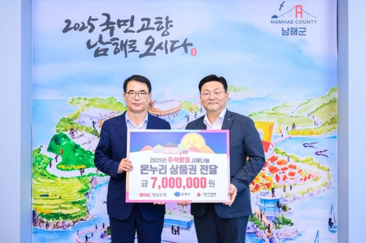 인사이드피플 노재현 기자 | 남해군은 지난 30일 BNK경남은행 남해지점이 추석 명절을 앞두고 700만원 상당의 온누리상품권을 기탁했다고 밝혔다.