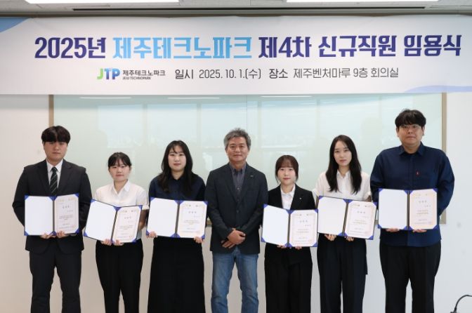 인사이드피플 심정보 기자 | 제주테크노파크(원장 지영흔, 제주TP)가 1일 제주벤처마루 9층 회의실에서 6명의 신규직원에게 임명장을 수여했다.
