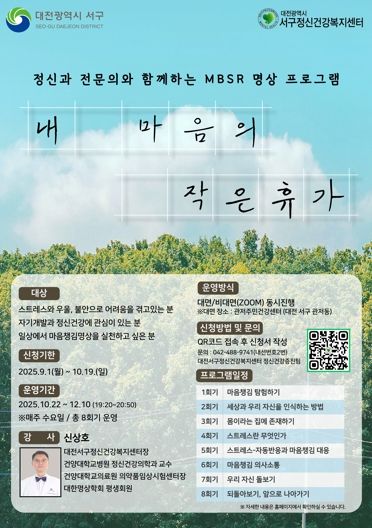인사이드피플 장은미 기자 | 대전 서구는 구민들의 스트레스 완화와 정신건강 증진을 위해 정신과 전문의와 함께하는 ‘마음 챙김 명상(MBSR)’ 프로그램 ‘내 마음의 작은 휴가’ 참여자를 10월 19일까지 모집한다.