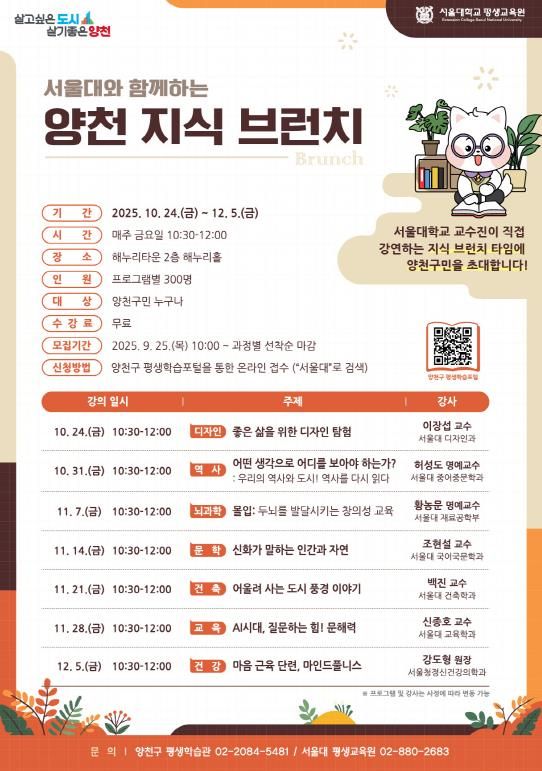인사이드피플 노재현 기자 | 양천구는 구민의 인문학적 소양을 넓히고 평생학습 문화를 확산하기 위해 서울대 교수진이 직접 출강하는 고품격 교양 프로그램 ‘양천 지식 브런치’를 오는 10월 말부터 7주간 해누리타운 해누리홀에서 운영한다고 10일 밝혔다.
