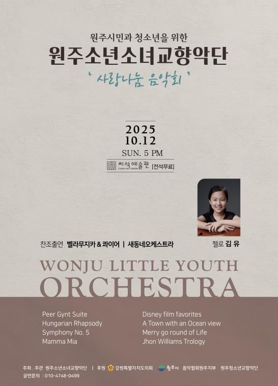 인사이드피플 강애자 기자 | 원주소년소녀교향악단은 오는 12일 오후 5시, 치악예술관에서 ‘사랑나눔음악회’를 통해 지역사회와 함께하는 따뜻한 무대를 마련한다.