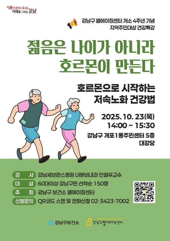 이번 특강은 지난 5월 강남구웰에이징센터에서 열린 ‘불멸의 호르몬으로 활기찬 노년을!’ 강연이 큰 호응을 얻은 데 힘입어 기획된 후속 프로그램이다. 최근 건강관리 트렌드로 주목받는 ‘저속노화’ 개념을 바탕으로, 일상에서 실천 가능한 호르몬 중심의 건강 전략을 주민들에게 소개할 예정이다.