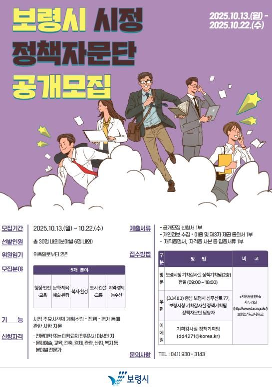 인사이드피플 노재현 기자 | 보령시는 지역 시정 발전에 대해 조언·권고·건의 등의 자문을 얻고자 보령시 시정 정책자문단 신규 위원을 10월 13일부터 22일까지 10일간 공개 모집한다고 밝혔다.