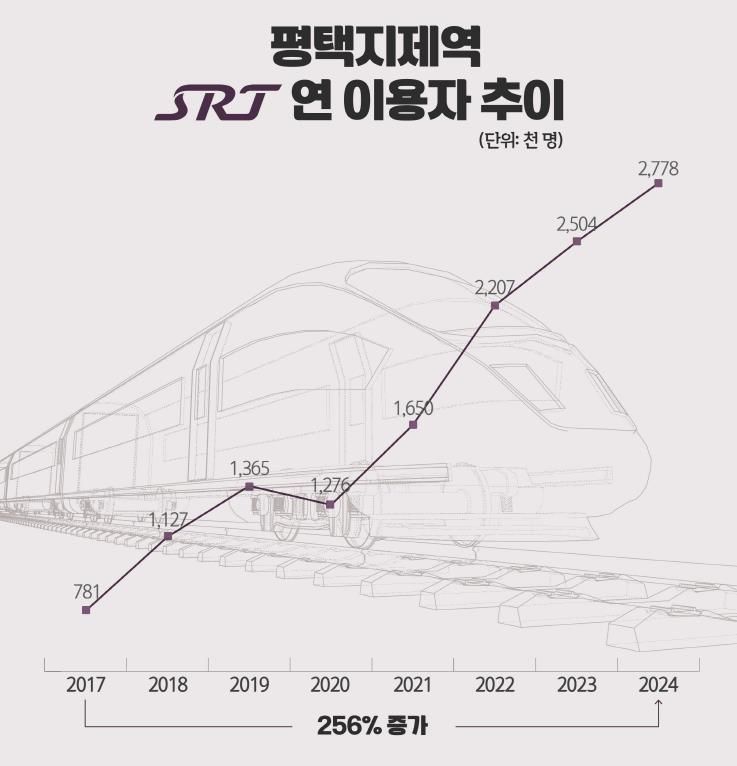 평택지제역은 2016년 개통 당시부터 SRT가 정차한 역사로, 매년 이용객 수가 꾸준히 증가하고 있다. 실제 ‘철도연감’에 따르면 평택지제역의 연간 SRT 승하차 인원은 2017년 78만 1천 명이었지만, 2024년에는 277만 8천 명으로 256%의 증가율을 기록했다. 이러한 증가율은 SRT 역사 중 가장 높은 수치다.