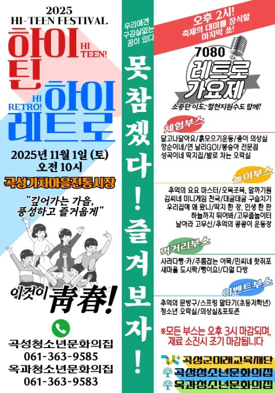 한편, 2025 곡성청소년 하이틴 페스티벌 ‘HI-TEEN, HI-RETRO’는 청소년들의 문화적 감성과 창의성을 표현할 수 있는 장으로, RETRO 가요제, 체험·놀이·먹거리·이벤트 부스 등 총 28개의 부스가 운영될 예정이다. 행사는 오는 11월 1일 곡성기차마을전통시장 일원에서 개최될 예정이다.